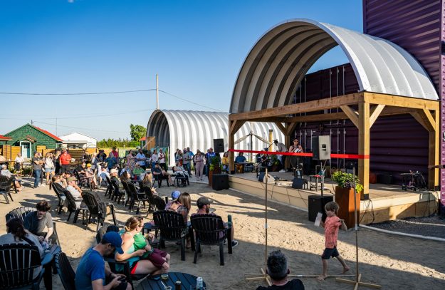 Once a club and dining hall for officers stationed on the base, This jewel of a building features two attached spaces, high ceilings, a curved bar and an outdoor terrace.