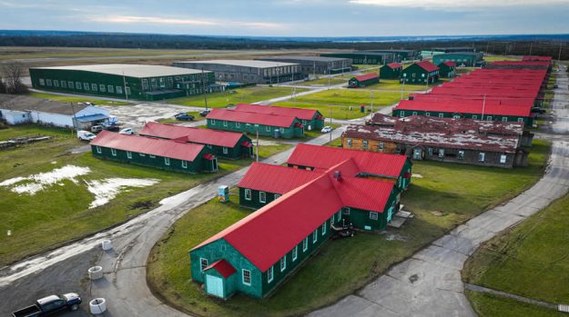 Once a club and dining hall for officers stationed on the base, This jewel of a building features two attached spaces, high ceilings, a curved bar and an outdoor terrace.